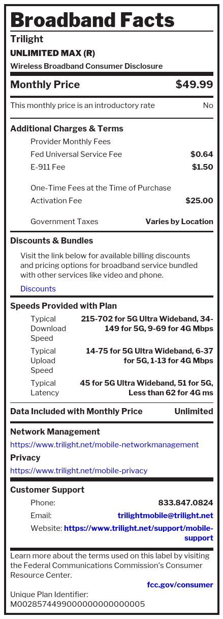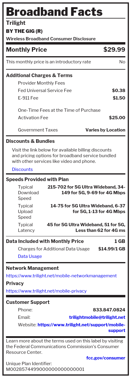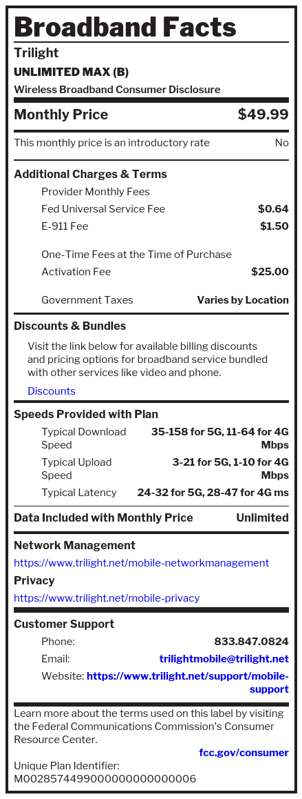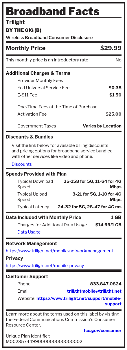Wireless Broadband LabelsWhat’s in your Trilight Mobile plan? For machine readable labels, click here.